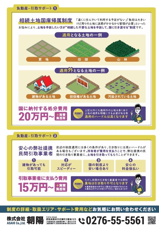 朝陽の「負動産」処分サポートは、あらゆる可能性を検討した上で、不動産の処分をサポートします。まずは売却ができないか、近隣で引き取ってくれるところはないか等も確認した上で、最終的な処分となります。まずはお気軽にご相談ください。